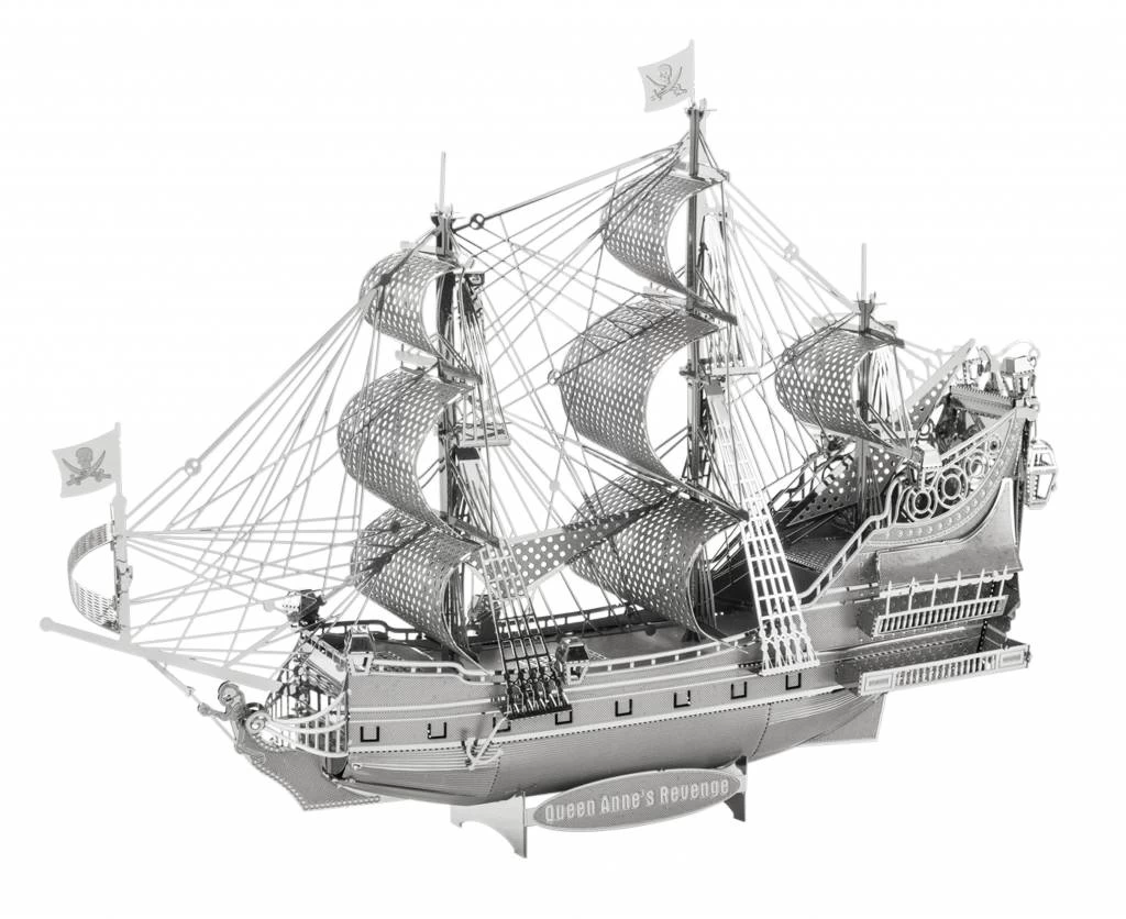 De Queen Anne’s Revenge bestaat uit 2 dunne metalen vellen. Haal eerst alle voorgesneden onderdelen uit de metalen vellen, door te knippen, te plooien of te draaien. Vervolgens kan je beginnen puzzelen. Plooi de onderdelen in de juiste vorm; zet 2 stukjes aan elkaar door lipjes of pinnetjes door een gleufje te schuiven, door te plooien,… Je kan dit model volledig in elkaar zetten zonder lijm! Een fijne knip- en punttang is wel handig om te gebruiken! In de verpakking staan de handige instructies steeds stap voor stap uitgelegd.