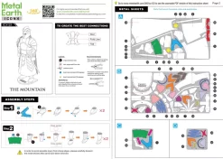 The Mountain bestaat uit 2,25 dunne metalen vel. Haal eerst alle voorgesneden onderdelen uit de metalen vellen, door te knippen, te plooien of te draaien. Vervolgens kan je beginnen puzzelen. Plooi de onderdelen in de juiste vorm; zet 2 stukjes aan elkaar door lipjes of pinnetjes door een gleufje te schuiven, door te plooien,… Je kan dit model volledig in elkaar zetten zonder lijm! Een fijne knip- en punttang is wel handig om te gebruiken! In de verpakking staan de handige instructies steeds stap voor stap uitgelegd.